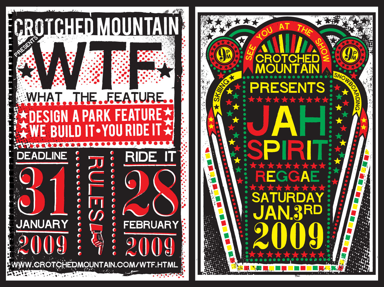 In addition to creating a weekly video for the Crotched Mountain Ski Area, I was also responsible for a series of posters to promote music and other events at the mountain. Because of the cost of the silk screen process I kept most posters down to one or two colors, but for their Reggae event we couldn’t help but add some fun “bling”.